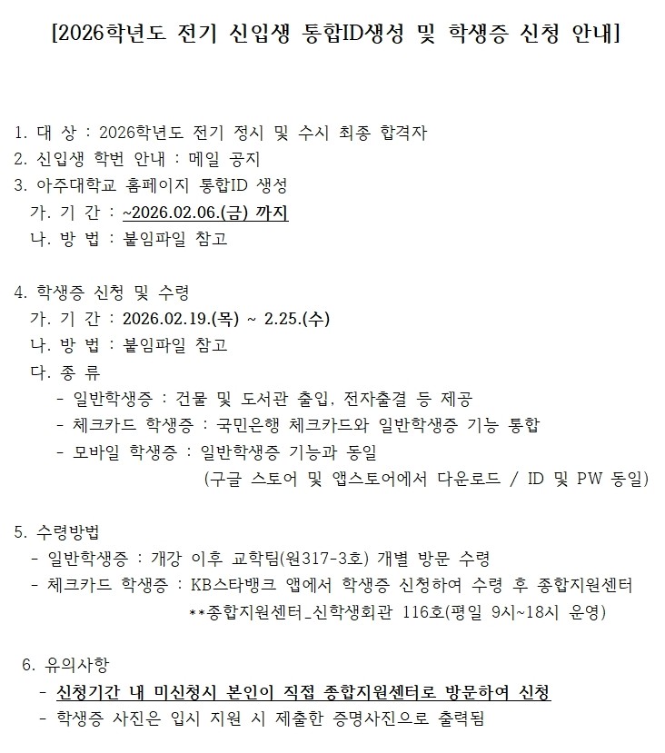 2026학년도 전기 신입생 통합ID생성 및 학생증 신청